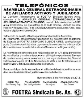 Se convoco a la Asamblea General Extraordinaria de afiliados activos y jubilados a realizarse en la sede del gremio, H.Yrigoyen 3171  en la ciudad de Buenos Aires el miércoles 14 de noviembre  a las 16 hs con el siguiente orden del día: